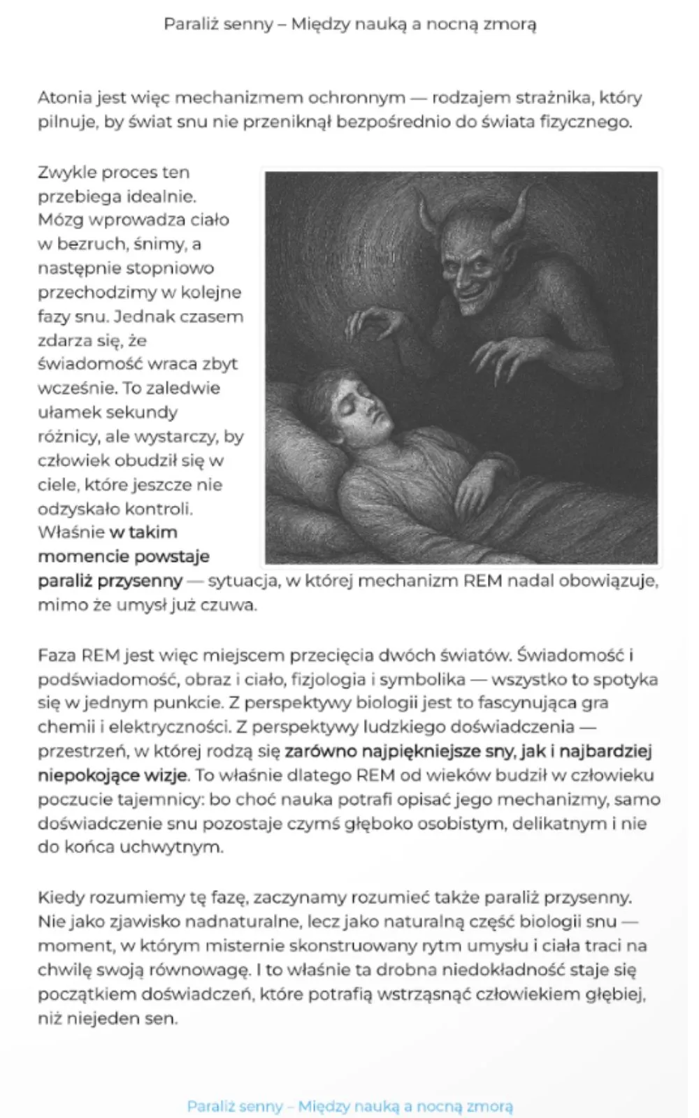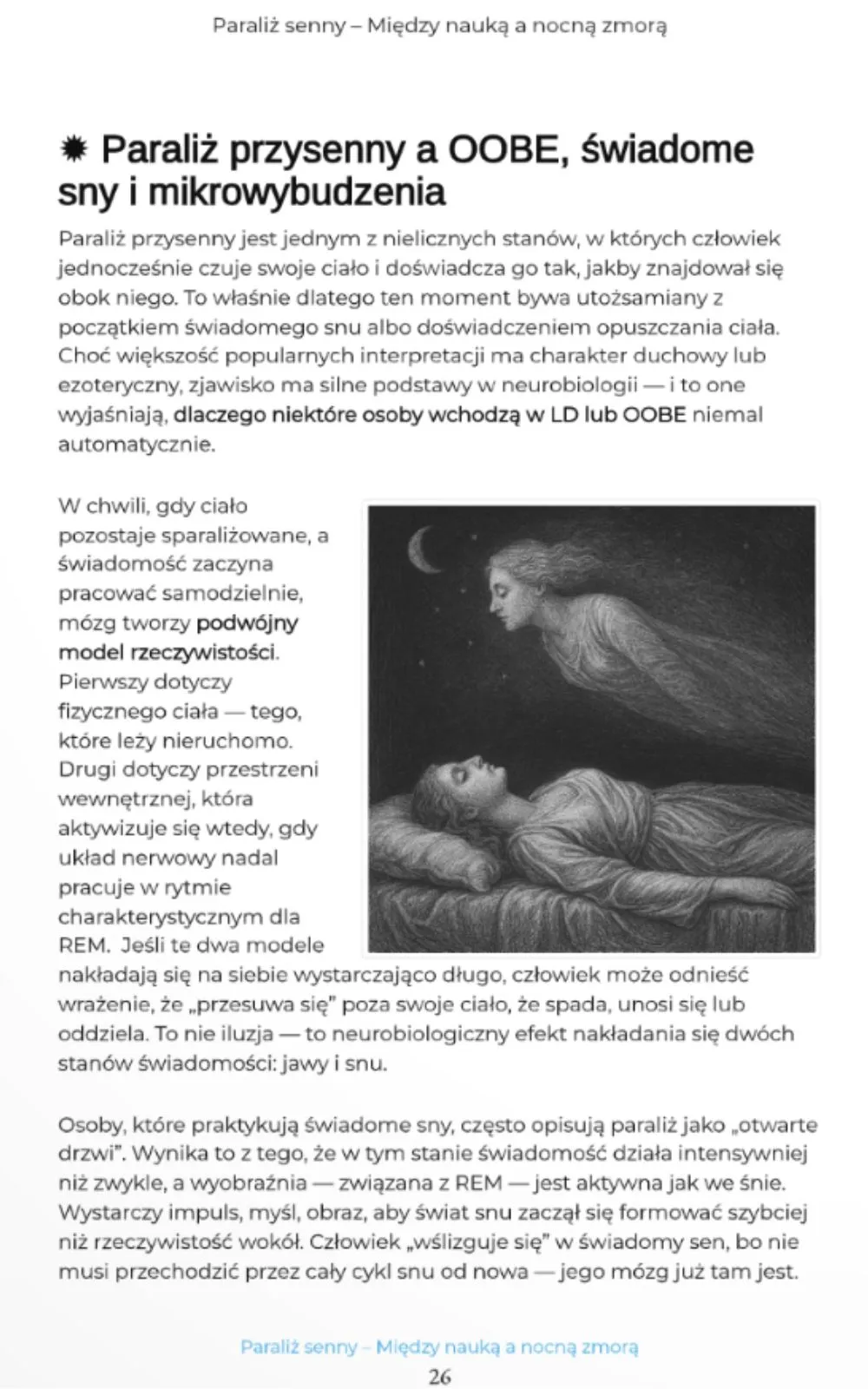 Ponad 100 stron rzetelnego wyjaśnienia: co dzieje się w mózgu, gdy świadomość budzi się szybciej niż ciało, skąd biorą się wrażenia obecności, ucisku i halucynacje oraz dlaczego przez wieki nazywano to „nocną zmorą”.