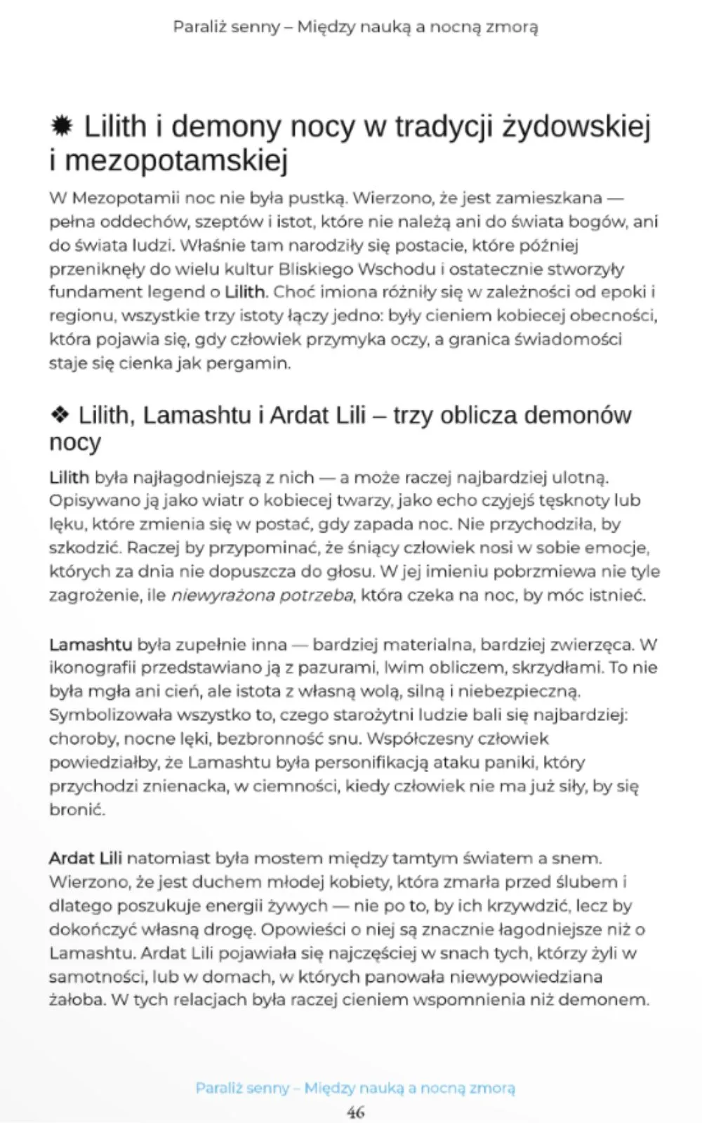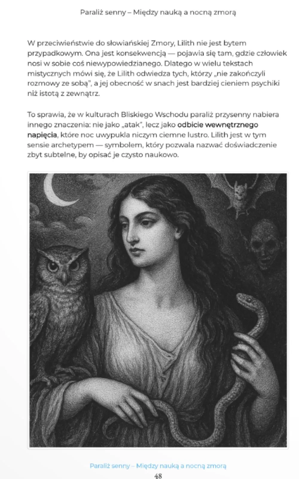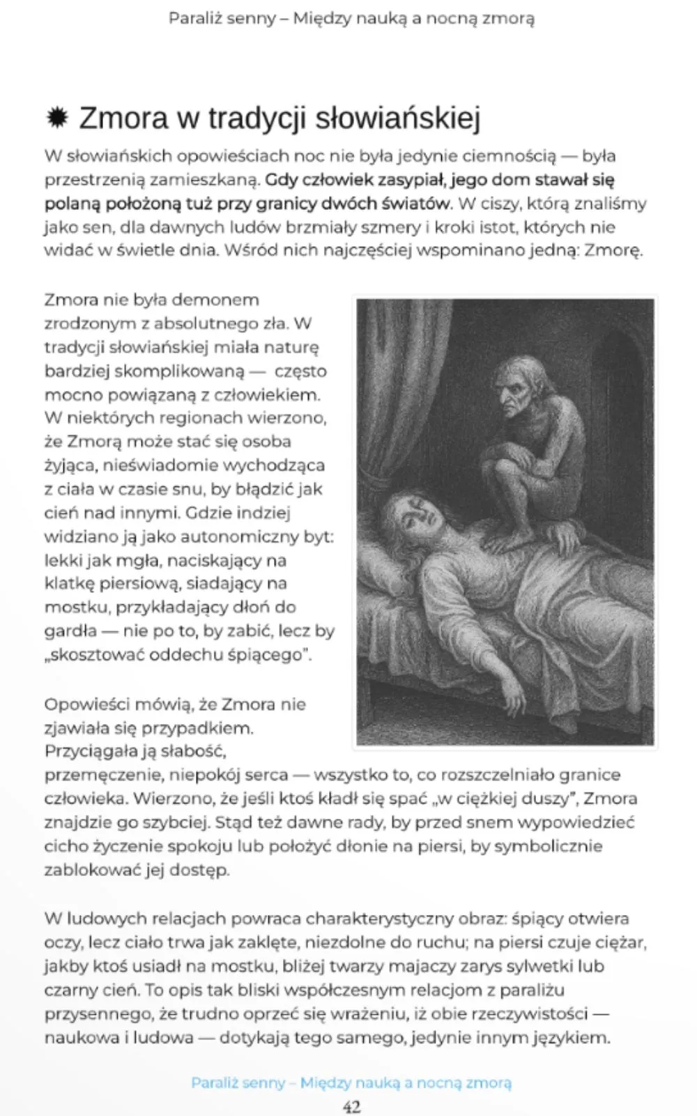 W części kulturowej książka pokazuje, jak to samo doświadczenie interpretowano przez wieki: jako nocną zmorę, demona snu czy „coś” siadającego na piersi. Mity i wierzenia nie są tu traktowane jako dowód – lecz jako zapis ludzkiej próby zrozumienia zjawiska, które dziś potrafimy opisać językiem neurobiologii.